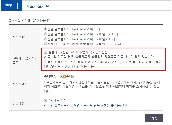 위 링크에서 발급 신청하실 때 꼭 실물카드 + 앱카드 동시 발급을 체크하세요!!