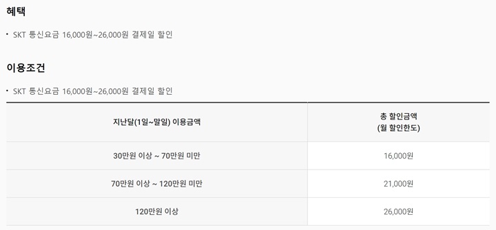 그 이유는 전월실적에 제외되는 항목이 거의 없었기 때문인데요. 상품권 결제도 실적으로 인정받아 실사용을 하지 않고도 통신비를 2.1만원까지는 쉽게 할인 받을 수 있었습니다.