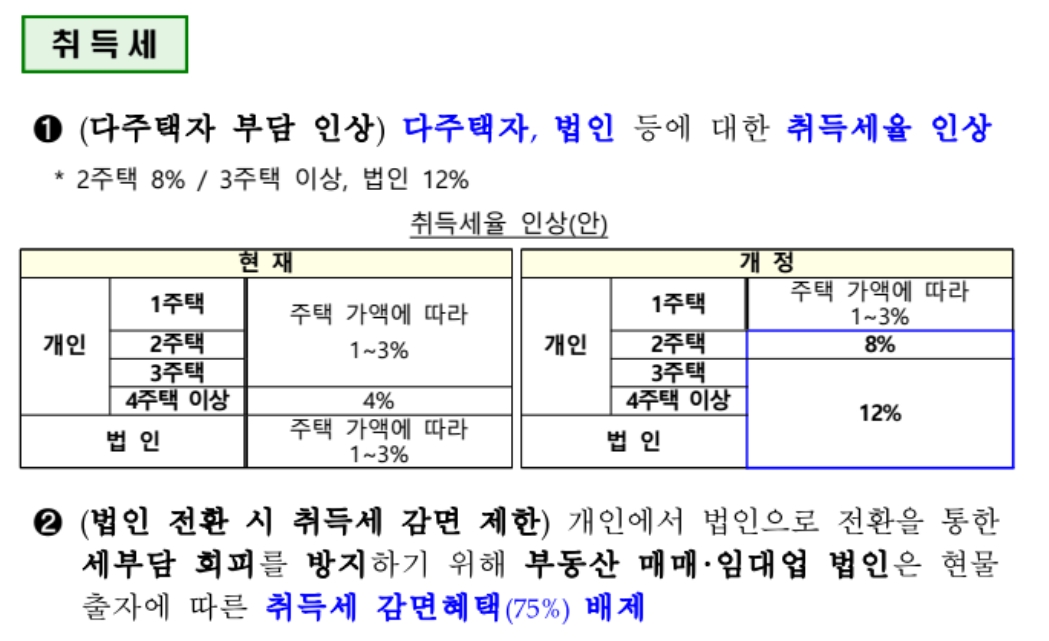 7.10 대책으로 다주택자에 대한 부동산 취득세가 강화되는 바람에