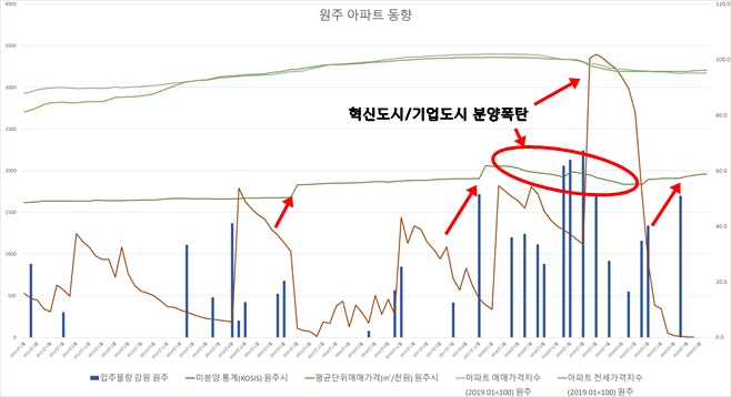 아래 차트를 보면 원주 아파트 가격은 미분양 불량에 영향을 받는 것을 확인할 수 있습니다.