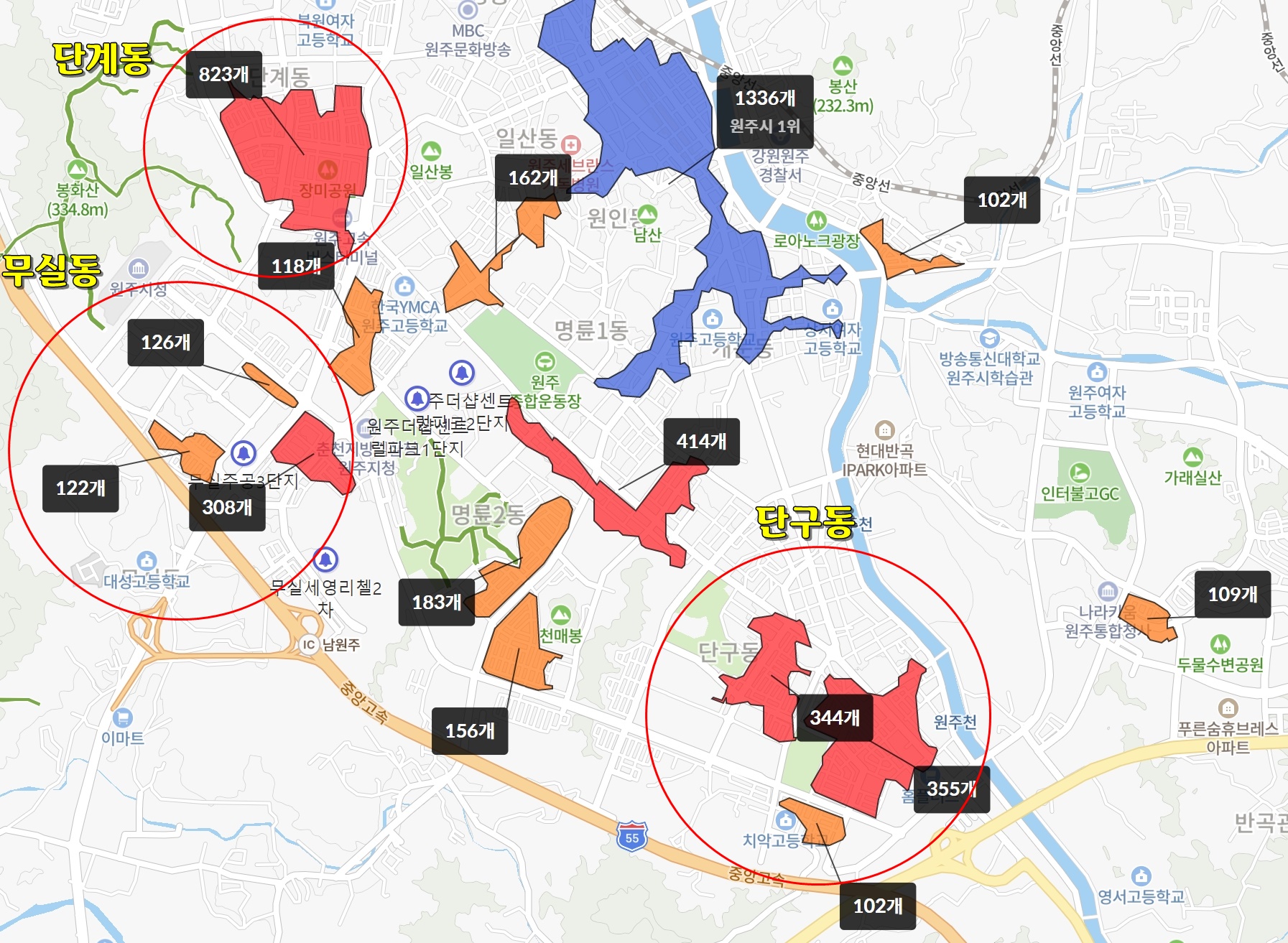 마지막으로 상권 입니다. 원주 구도심, 단계동, 단구동, 무실동 순서 입니다.
